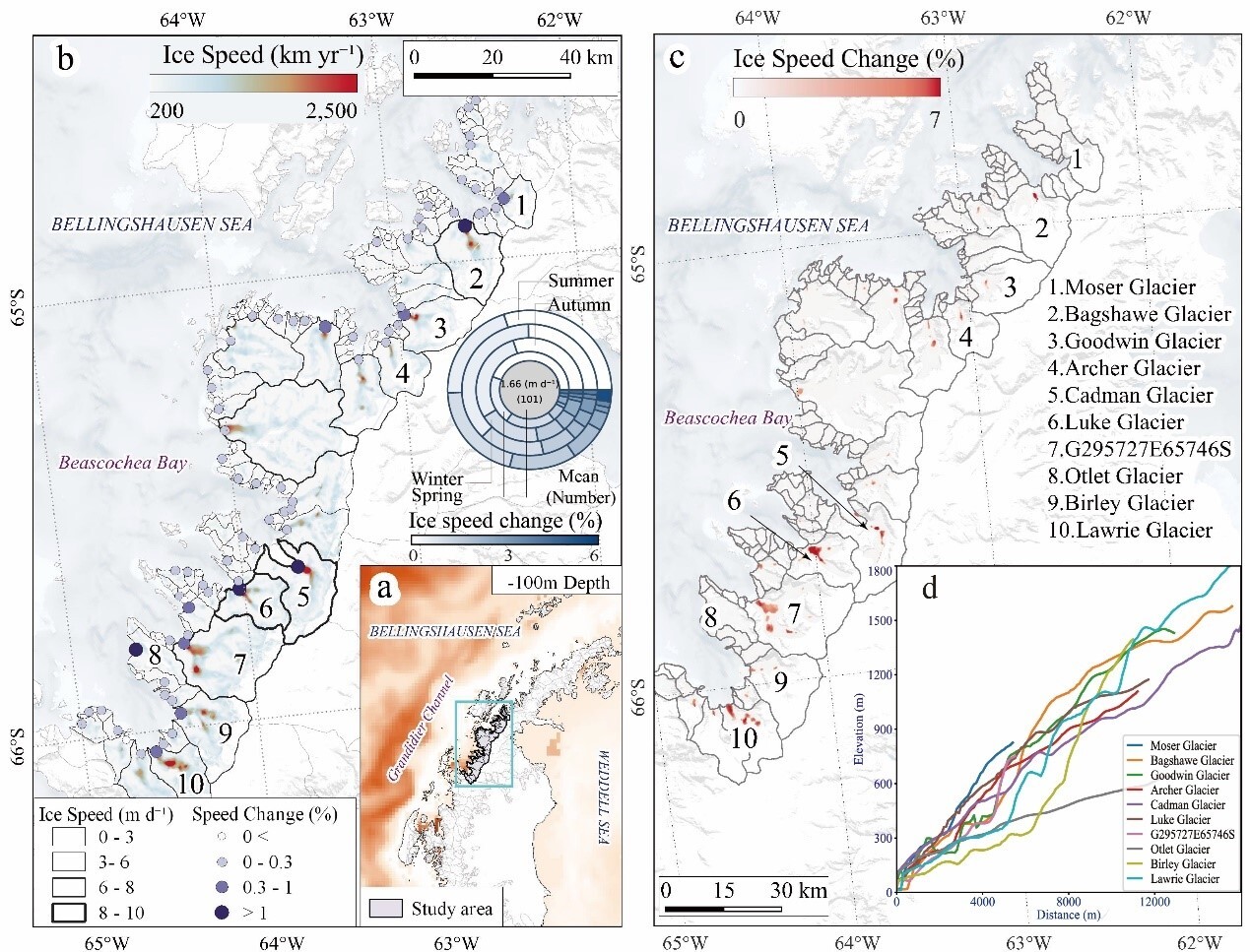 中國科學院西北生態(tài)環(huán)境資源研究院冰凍圈科學與凍土工程全國重點實驗室康世昌研究員團隊,基于2015年5月至2025年4月的Sentinel-1衛(wèi)星觀測數據,系統分析了南極半島Beascochea海灣101條冰川流速變化特征,重點揭示了海灣上層海水變暖對冰川流速加快的關鍵作用。